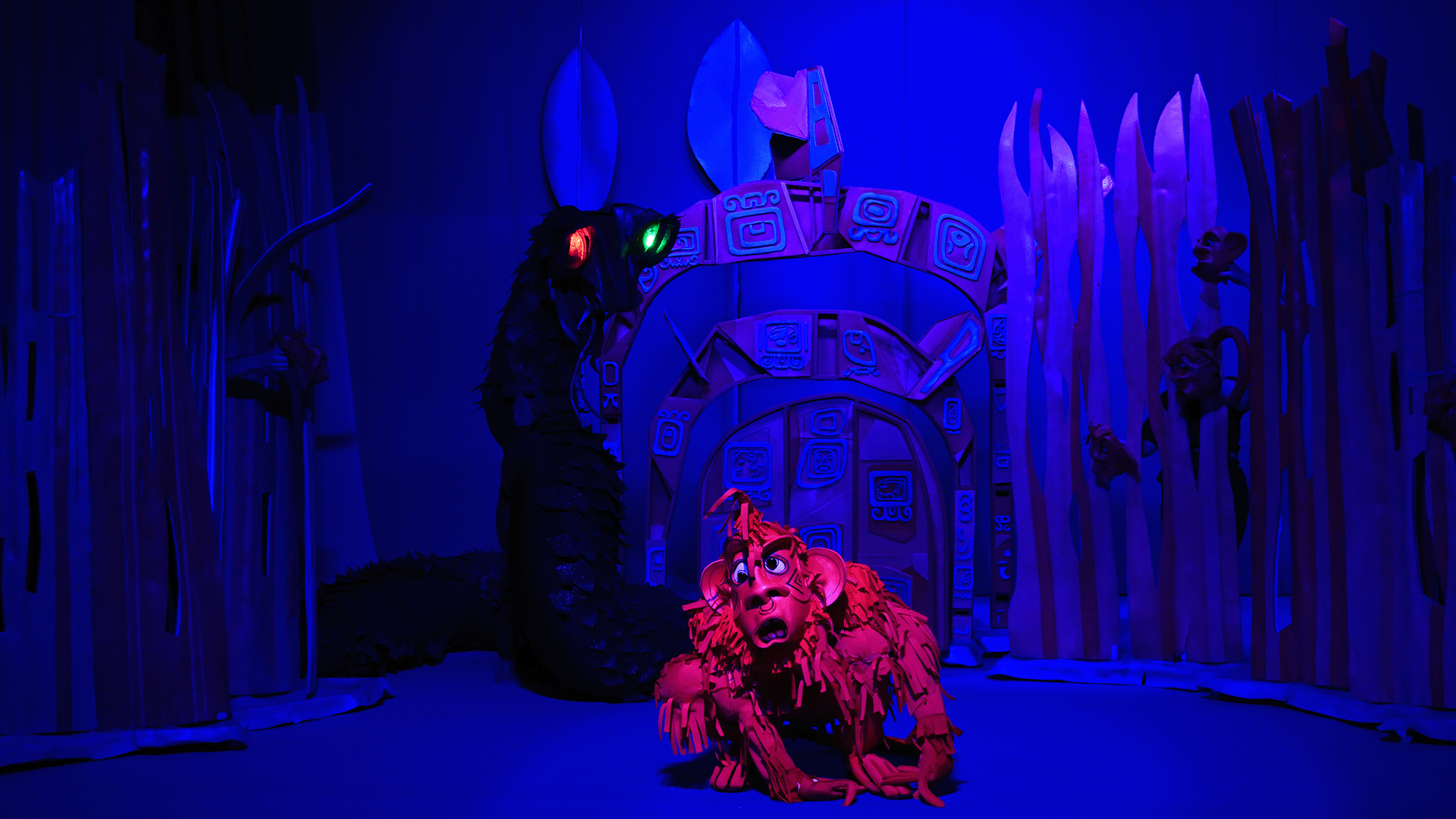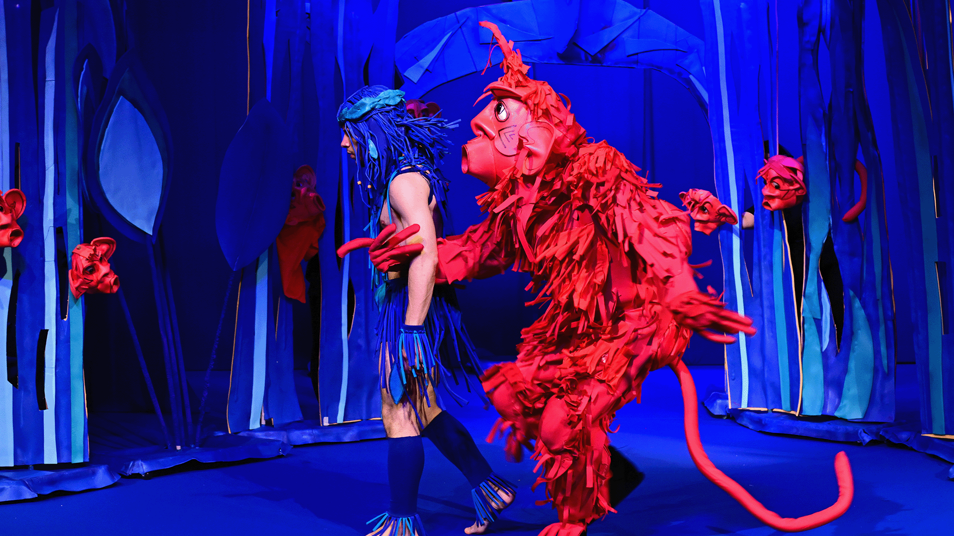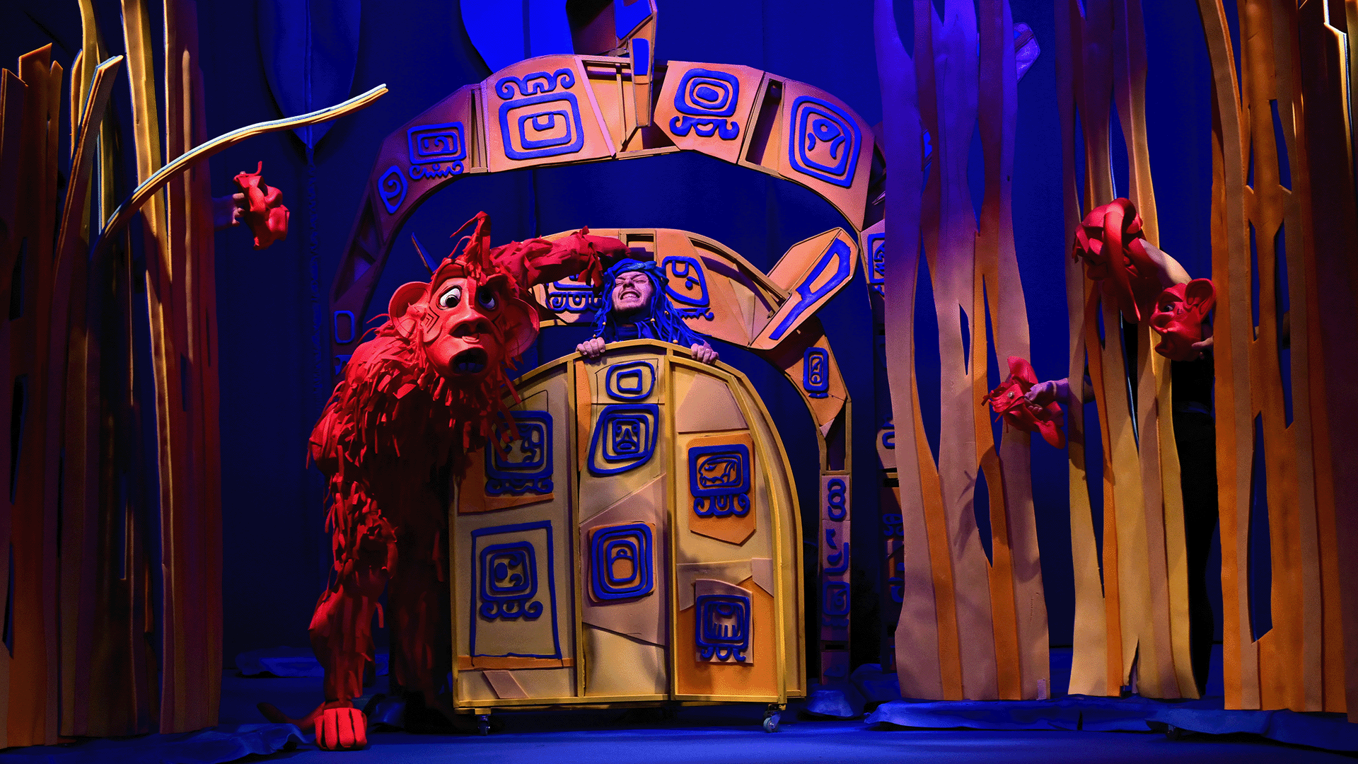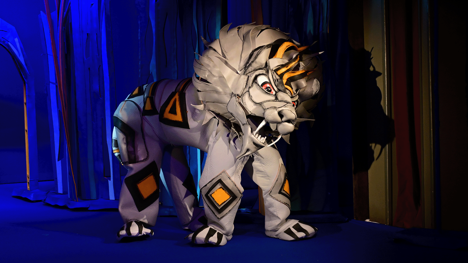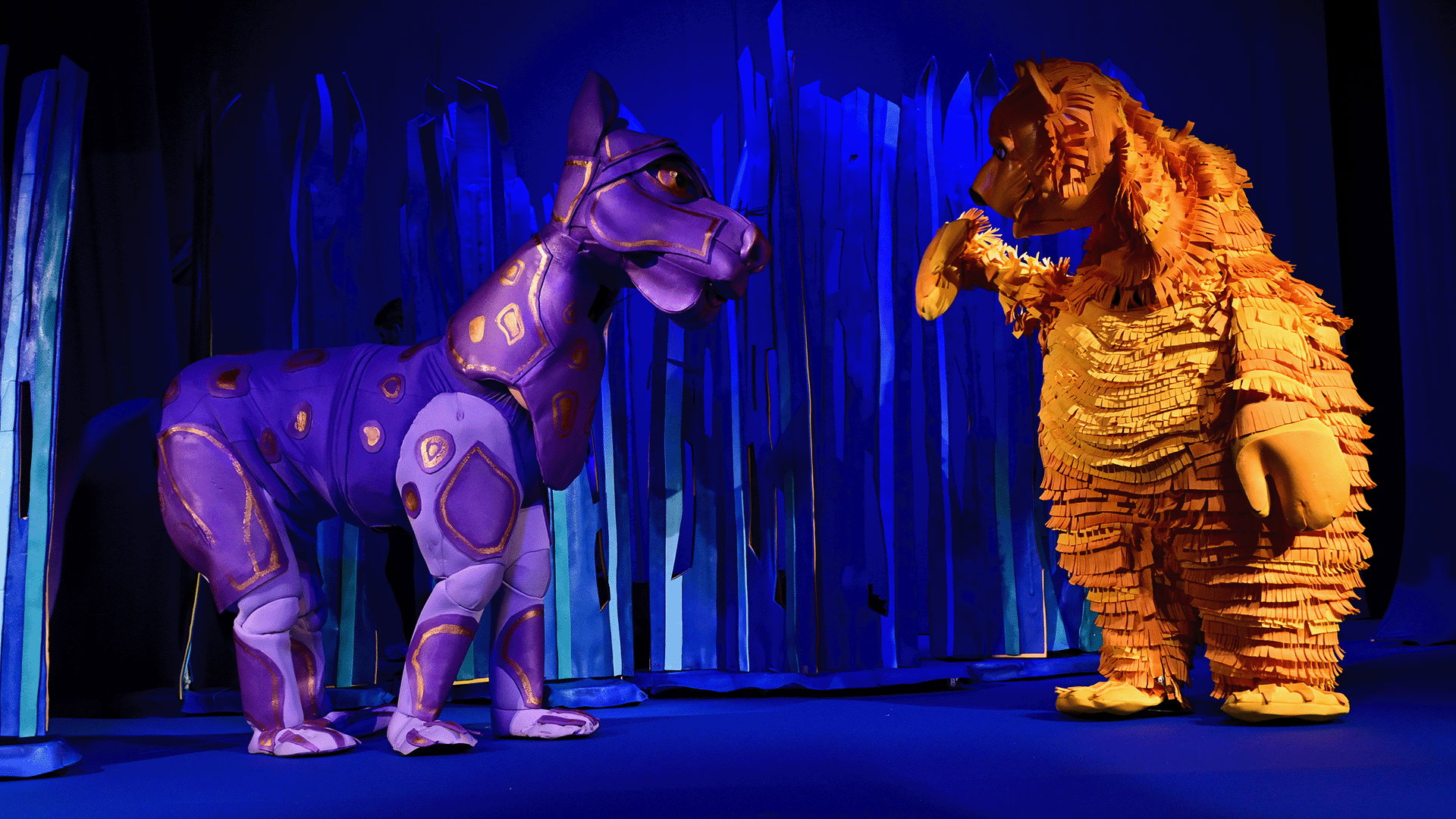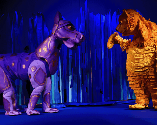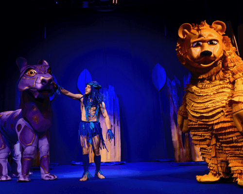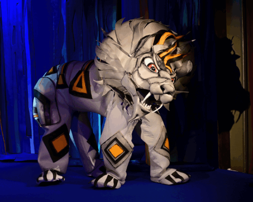 Маугли се изпълнява от актьор в жив план, а животните са огромни кукли.