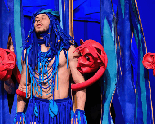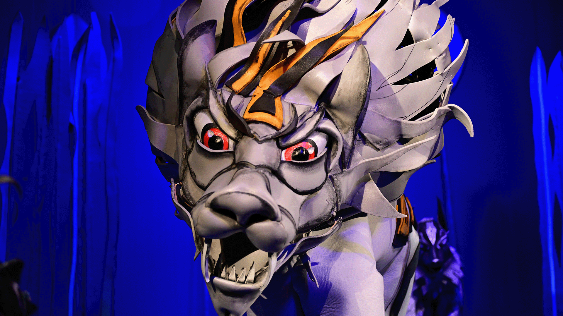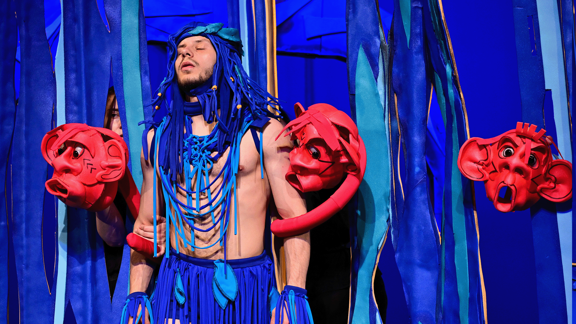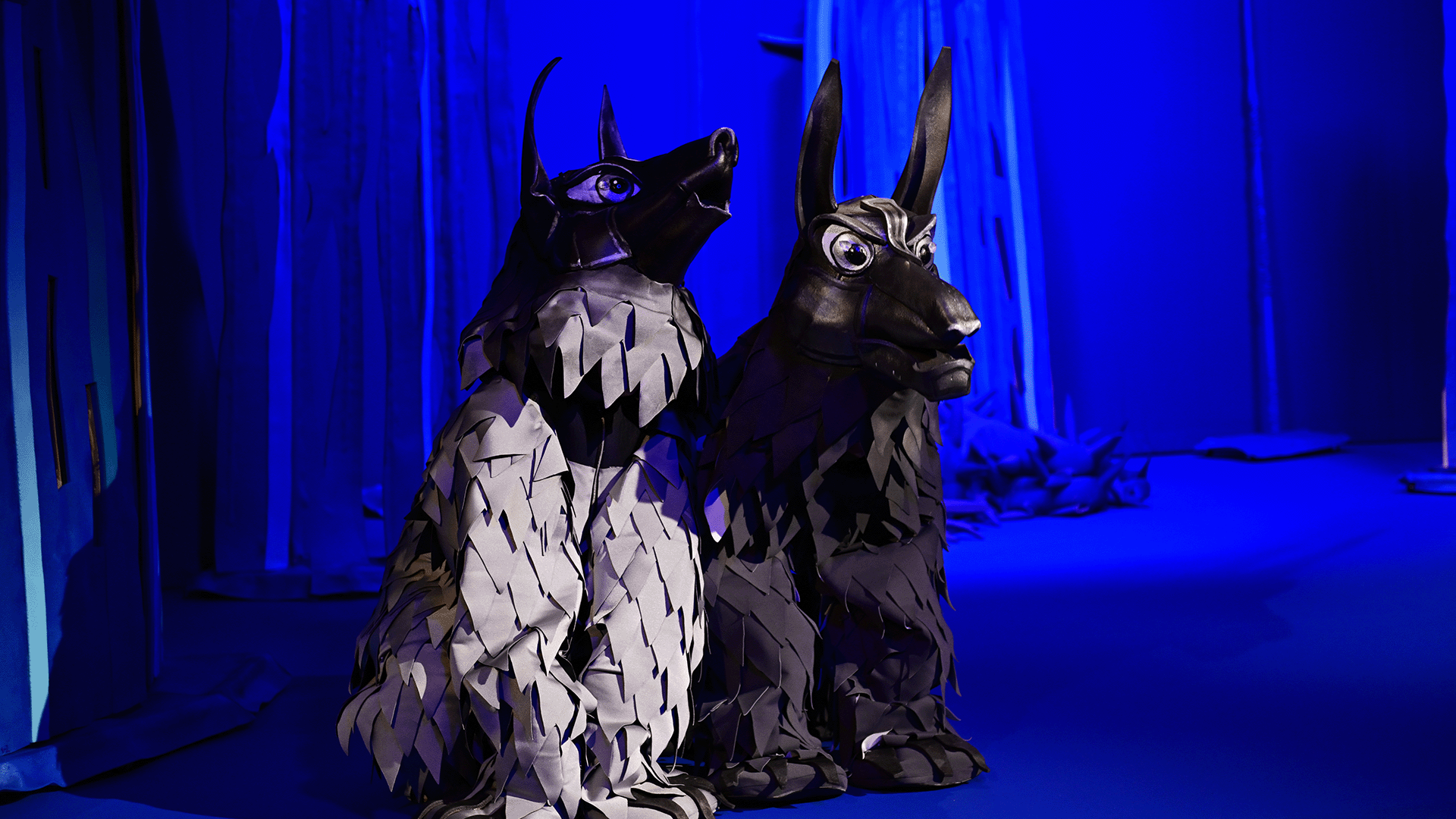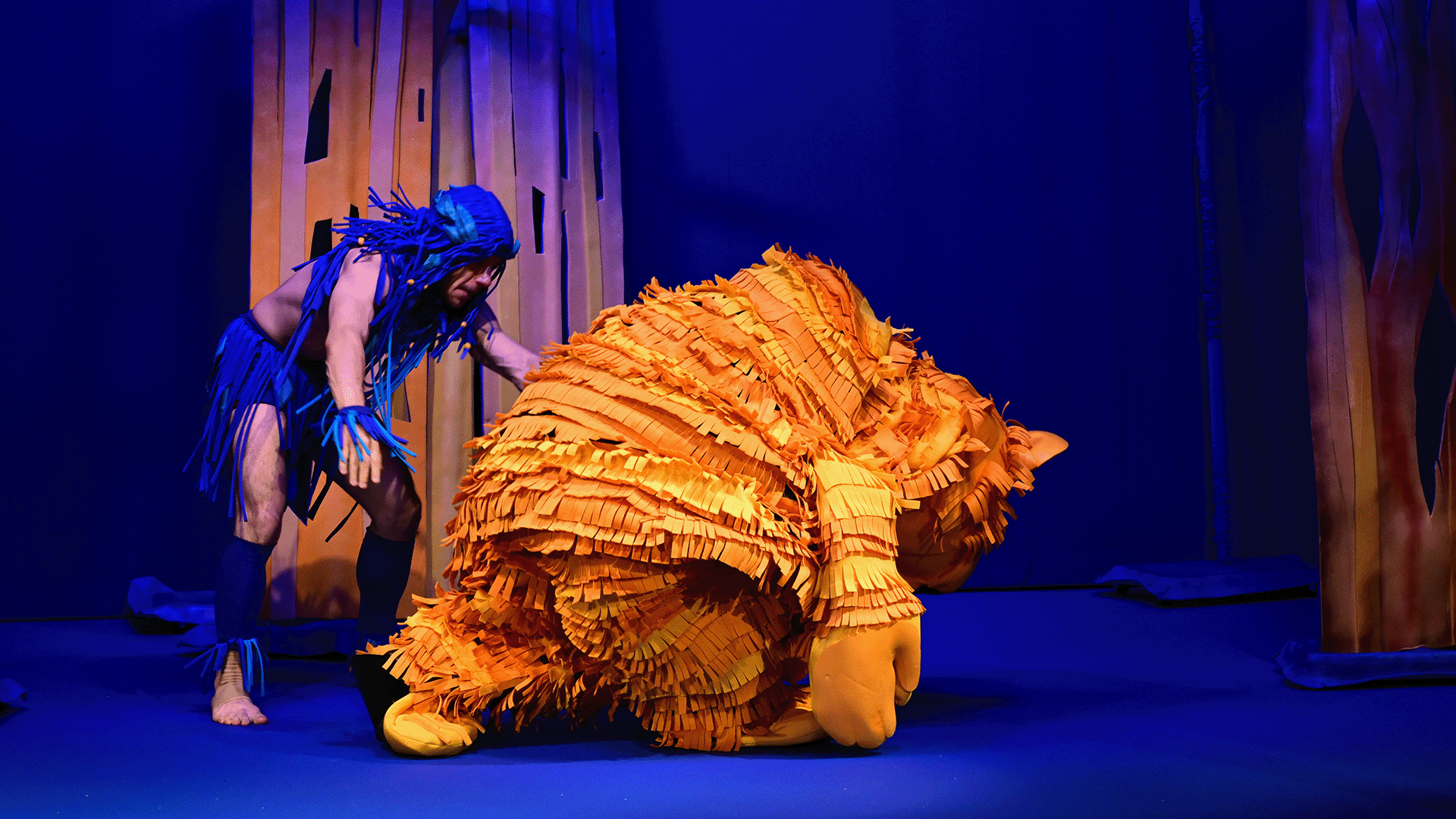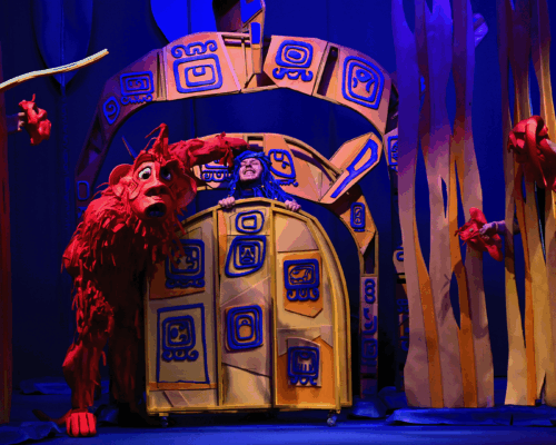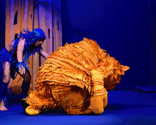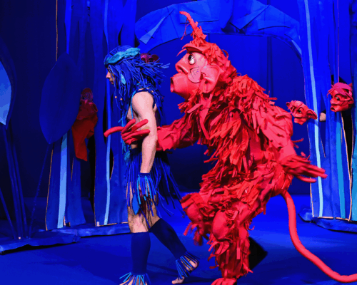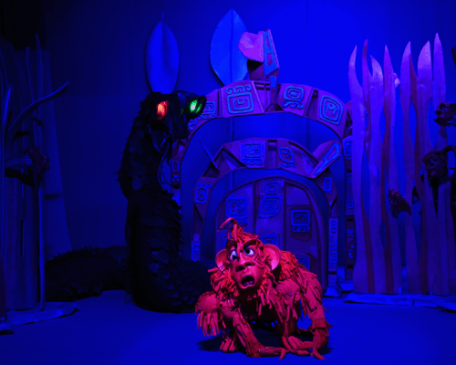 Маугли се изпълнява от актьор в жив план, а животните са огромни кукли.